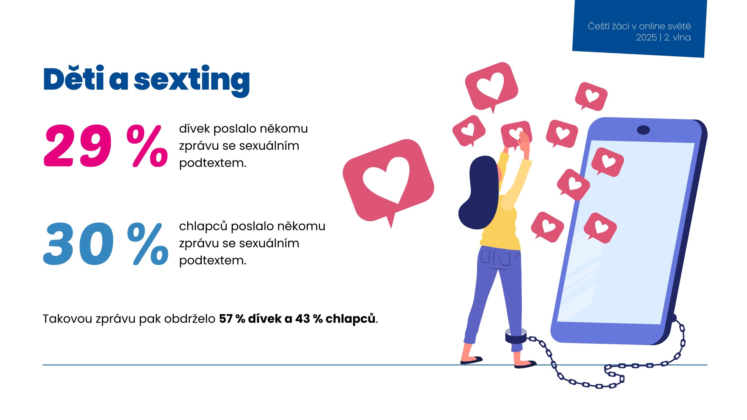 Safer Internet Centrum a Univerzita Palackého zveřejnily druhou část svého výzkumu s názvem Čeští žáci v online světě, který se zaměřil na sdílení osobních údajů, seznamování, sexting a vystavování se sexuálnímu obsahu. Průzkum proběhl mezi více než 42 tisíci respondenty ve věku 13 až 17 let, z nichž bylo 22 tisíc dívek a 20 tisíc chlapců. Z výzkumu například vyplynulo, že málo dětí je online ve společném prostoru s rodiči, kteří by tak mohli mít přehled, jaký obsah si na internetu děti vybírají.