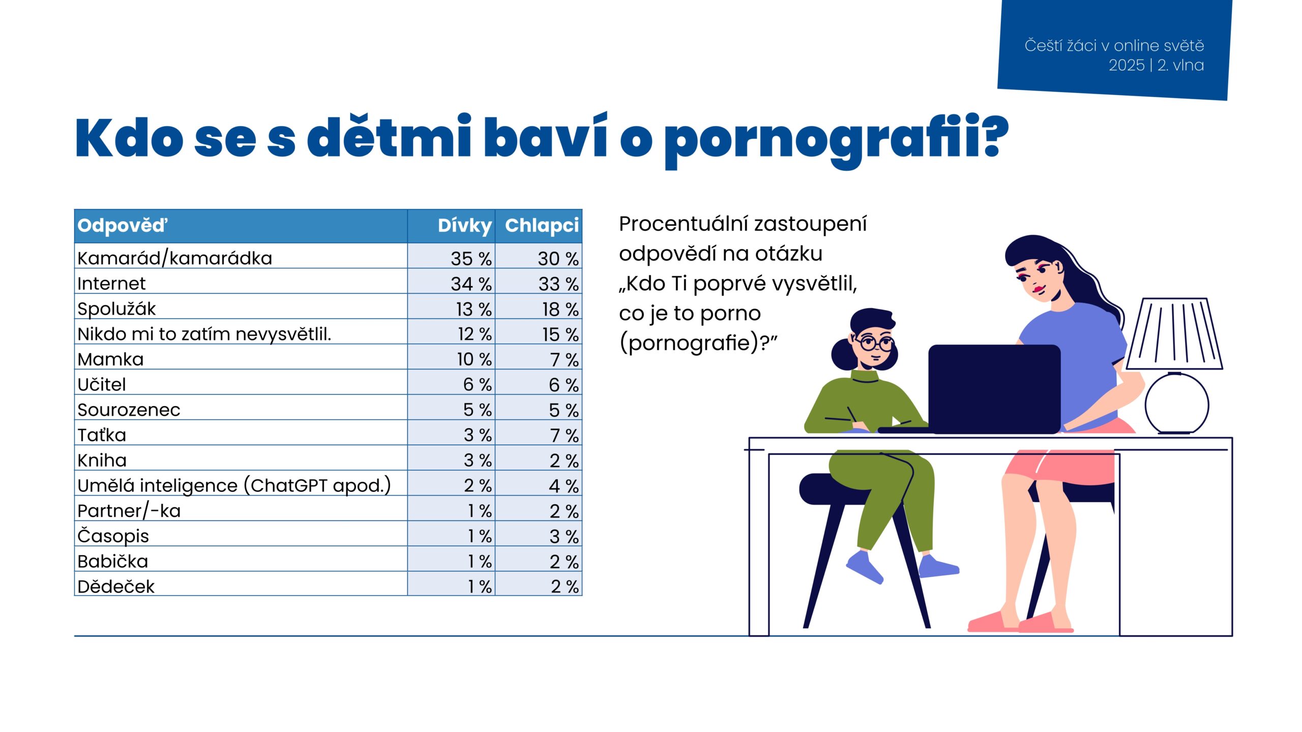 Výsledky výzkumu potvrdila i slova Zory Duškové z Dětského krizového centra. „Uživatelská znalost dětí je dneska veliká a dostávají se pravidelně ke konzumaci pornografie děti pod 10 let. Já jako klinický psycholog musím říct a zdůraznit, že to je věk, který předbíhá přirozený psychosexuální vývoj většiny dětí a je to něco, co děti poškozuje z hlediska jejich psychosexuálního vývoje.“